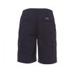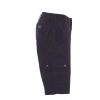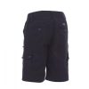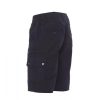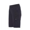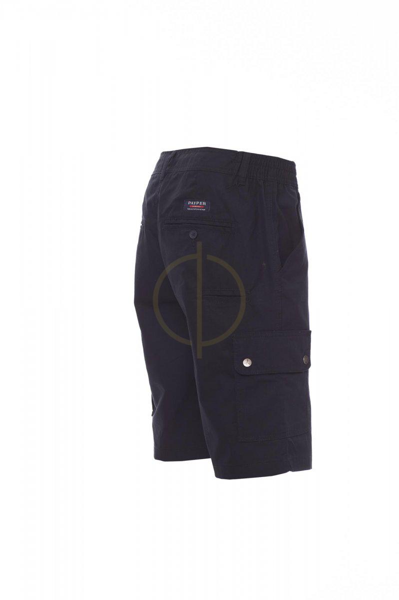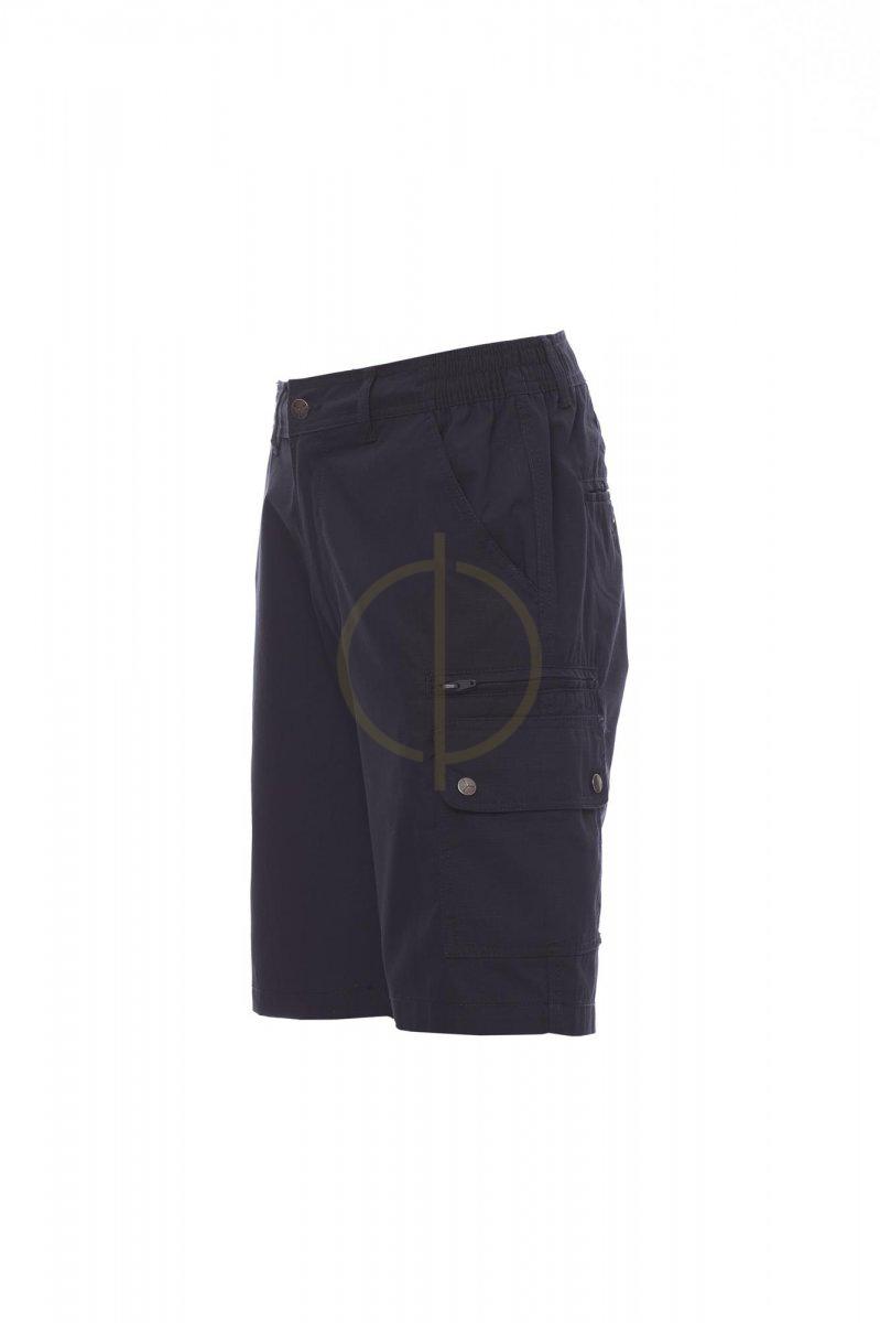 Muške bermude, bočni rastezljivi pojas i omče za remen, letvica s metalnim patentnim zatvaračem i gumbom, 2 prednja džepa klasičnog kroja, 2 bočna džepa s preklopom i kopčama, 1 džep s patentnim zatvaračem lijevo, 1 džep za ravnalo desno, 2 stražnja prošivena džepa s gumbom i rupom za gumb.