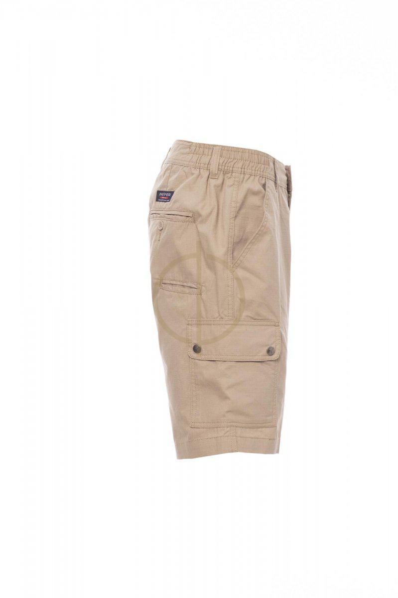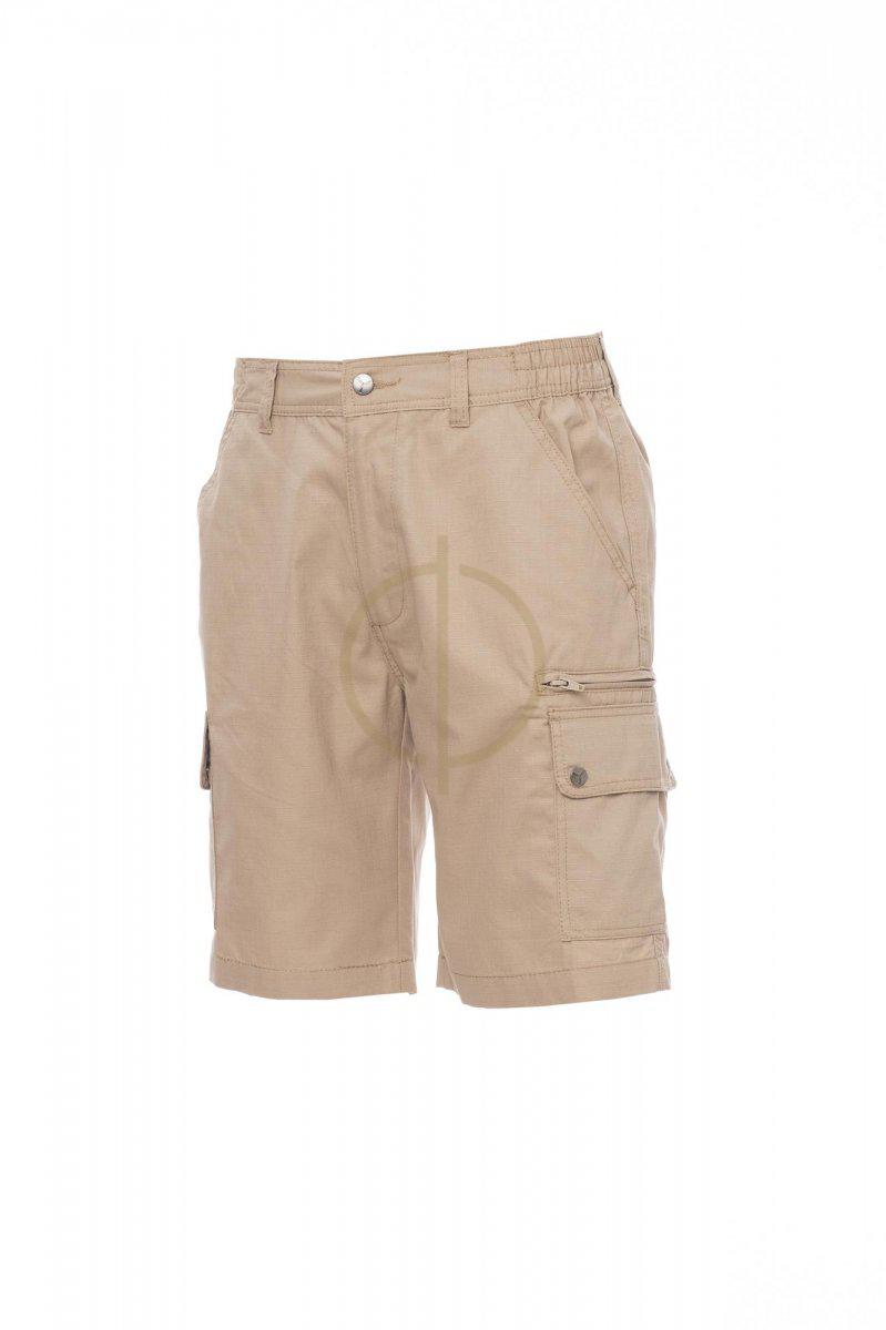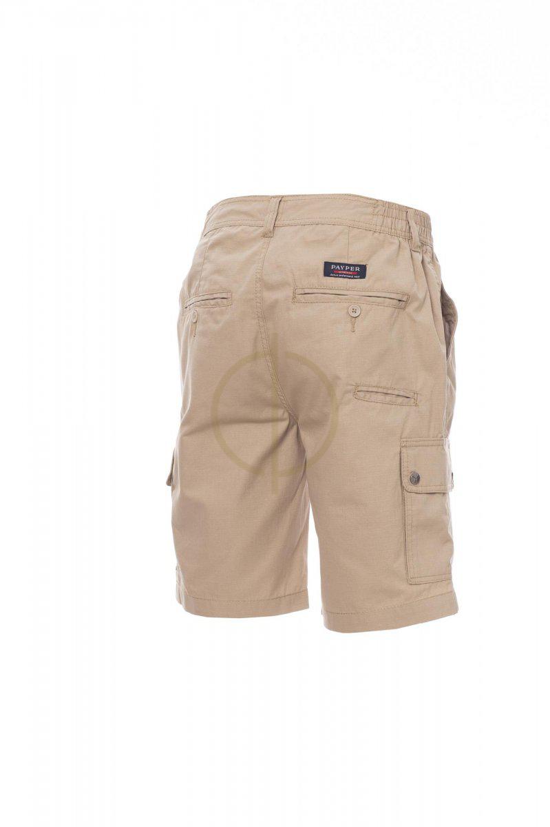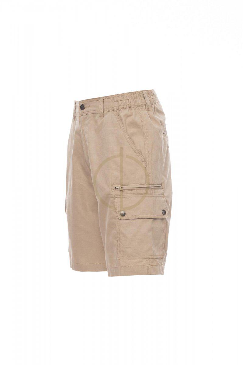 Muške bermude, bočni rastezljivi pojas i omče za remen, letvica s metalnim patentnim zatvaračem i gumbom, 2 prednja džepa klasičnog kroja, 2 bočna džepa s preklopom i kopčama, 1 džep s patentnim zatvaračem lijevo, 1 džep za ravnalo desno, 2 stražnja prošivena džepa s gumbom i rupom za gumb.