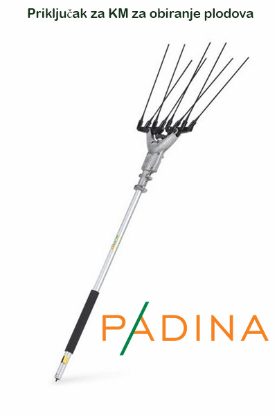 Priključak za KM. Jednostavan za korištenje i malih vibracija. Za obiranje maslina i sličnog voća. Težina 1.95 kg, duljina 1.44 m. Za djeljive uređaje s okruglom ručkom.